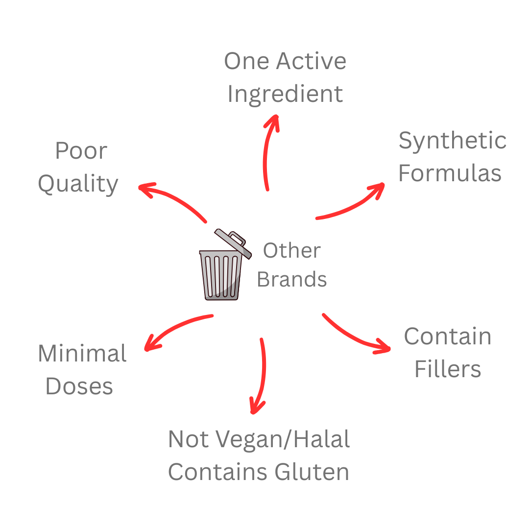 Our all-in-one synergistic formulations bridge the gap between functionality and simplicity in the supplement industry.
